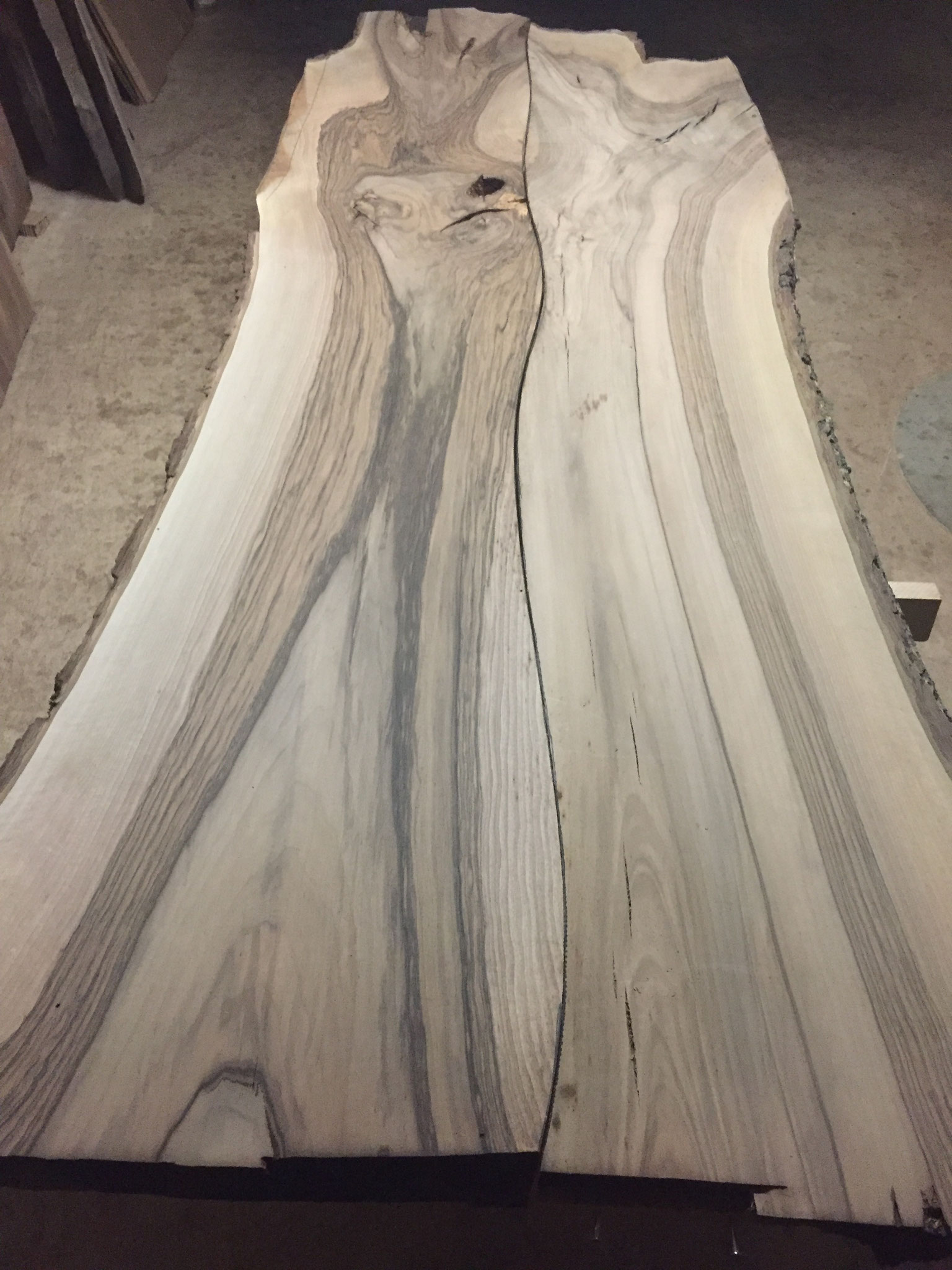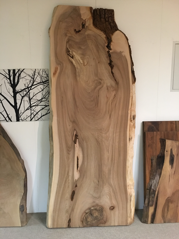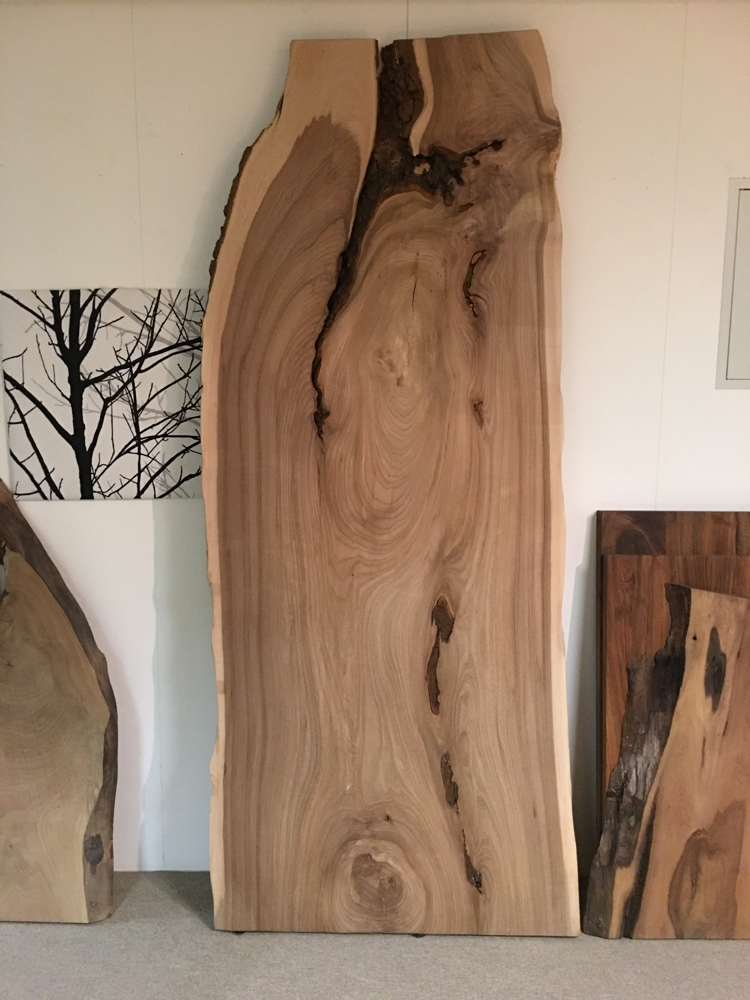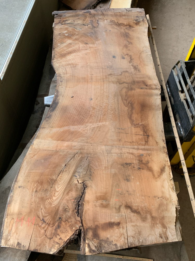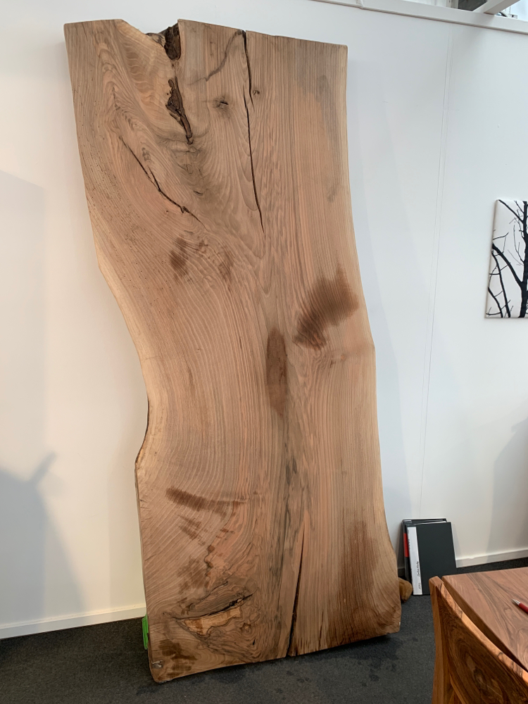 Tisch aus Ulmenholz Schweiz. Teils mit Rinde. Länge 221cm,  Breite 87-92cm  Zuspitzung auf 1 Seite auf 60cm Breite.