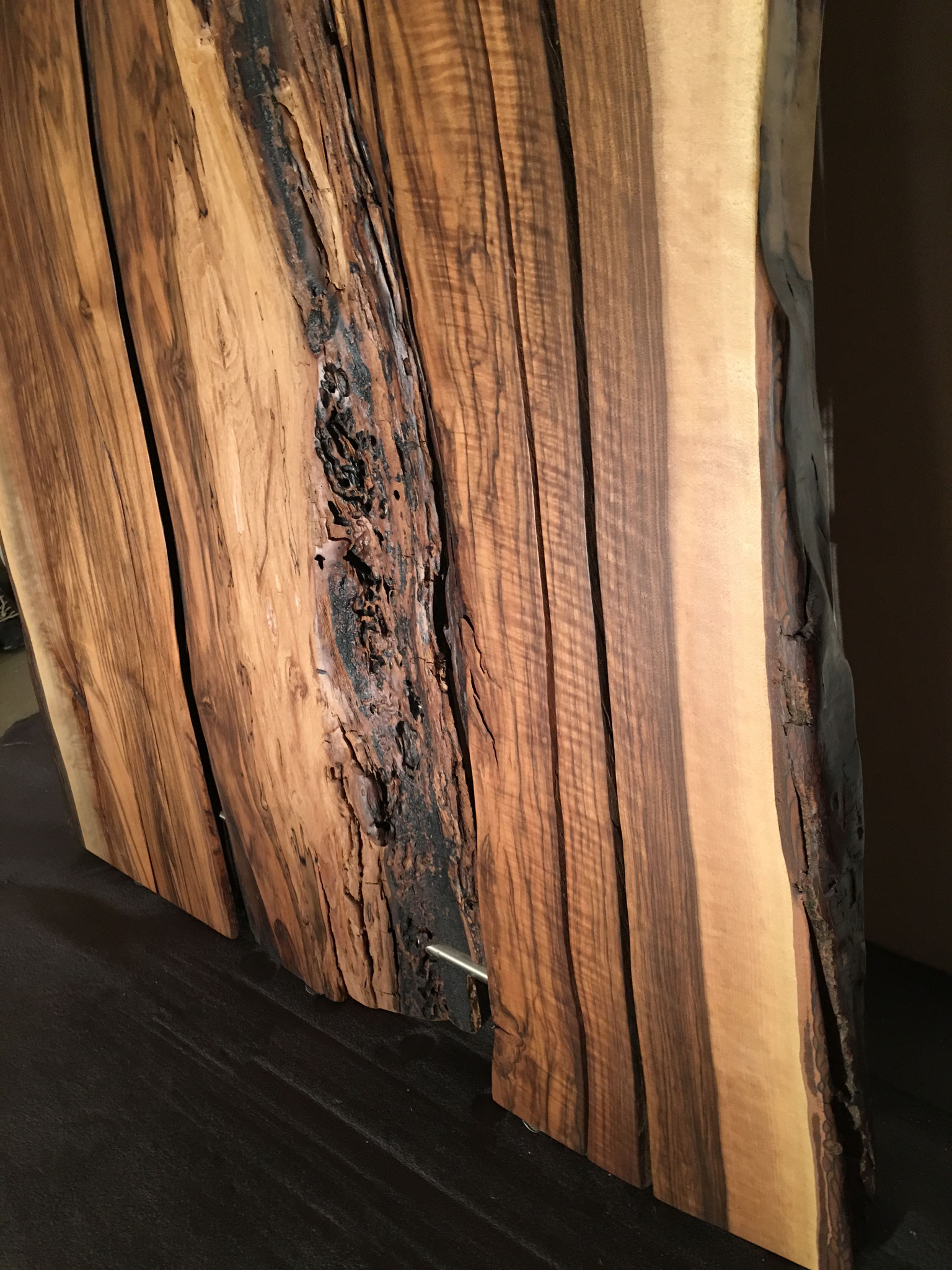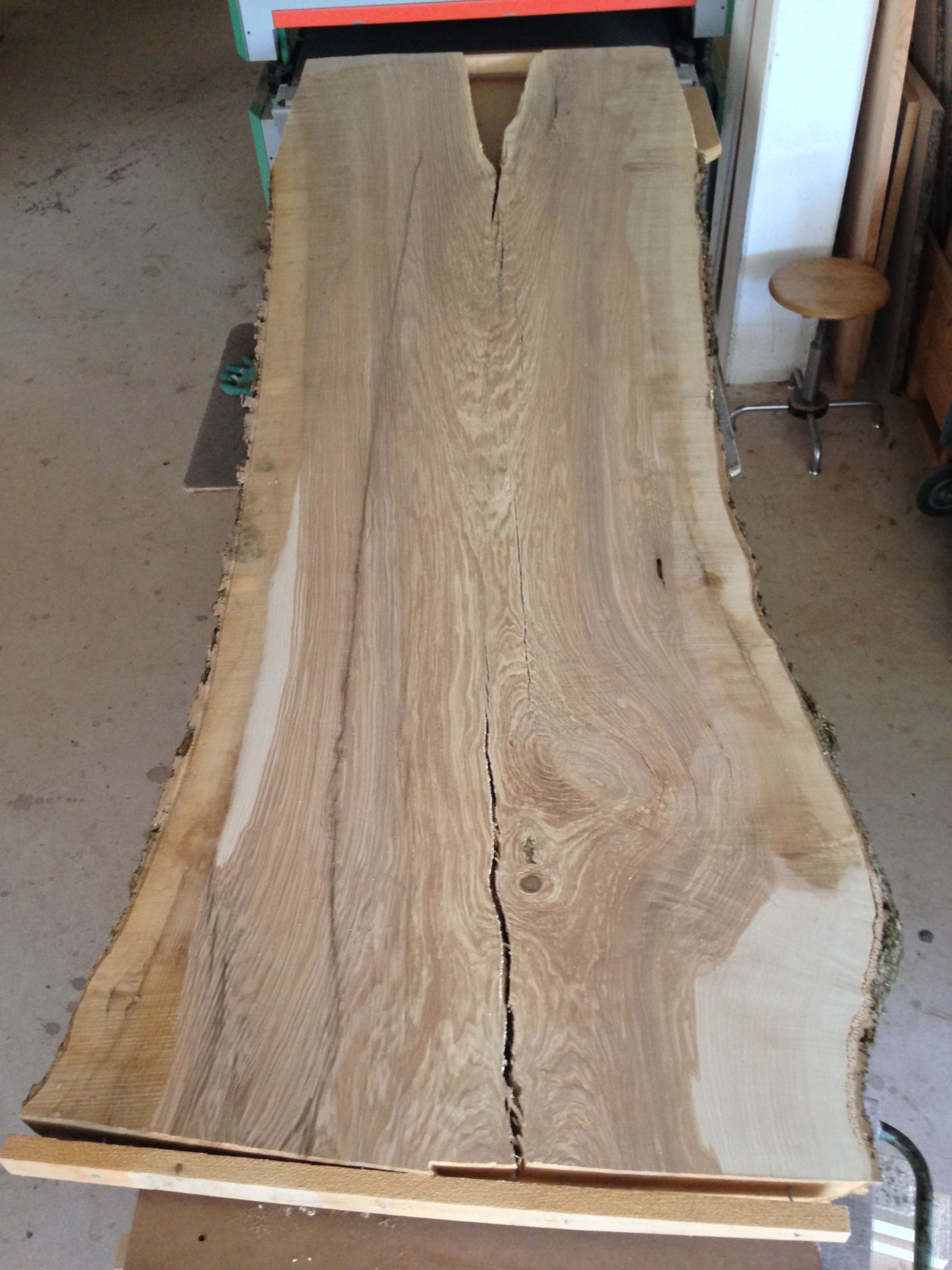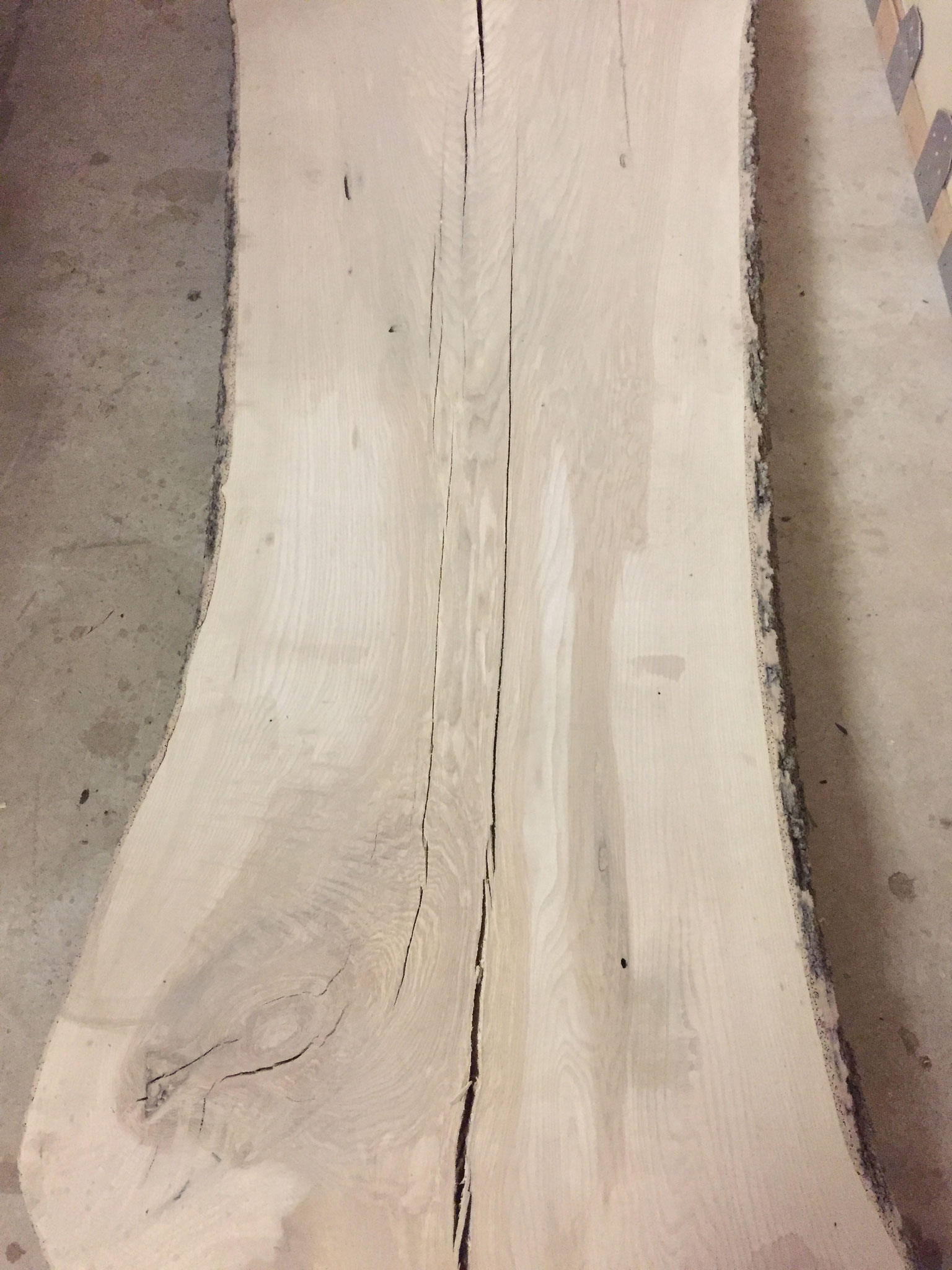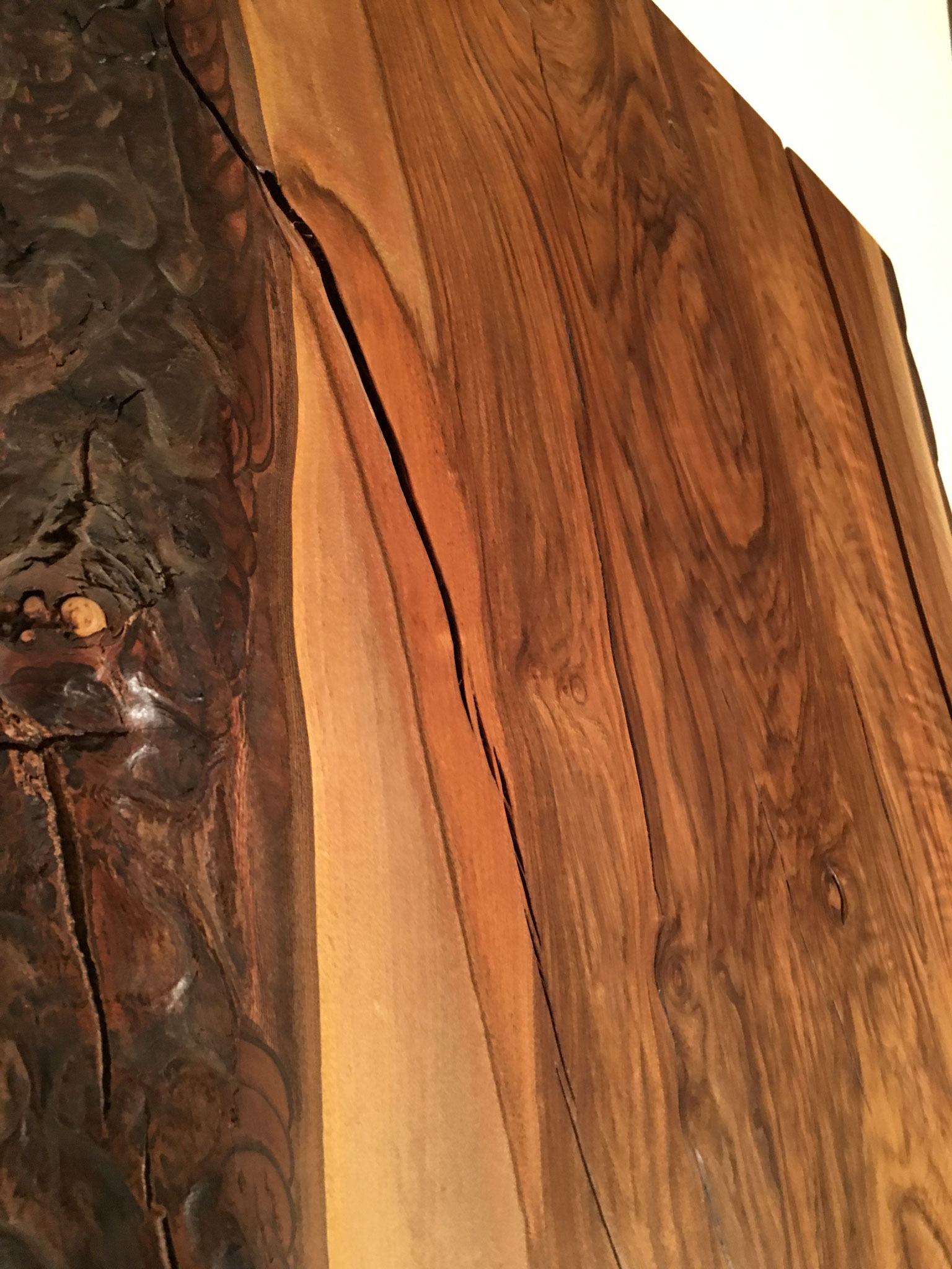 Tisch aus Ulmenholz Schweiz. Teils mit Rinde. Länge 221cm,  Breite 87-92cm  Zuspitzung auf 1 Seite auf 60cm Breite.