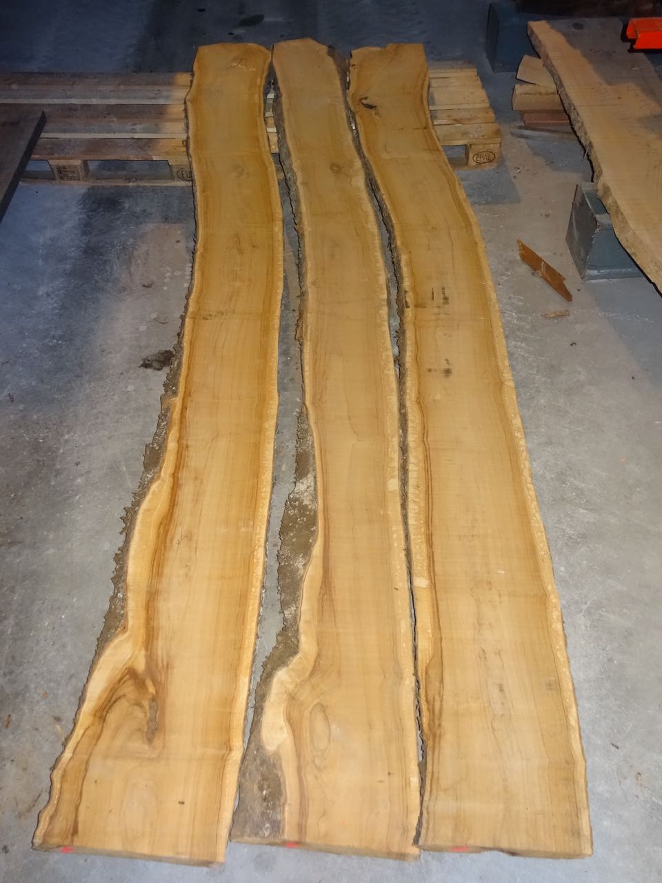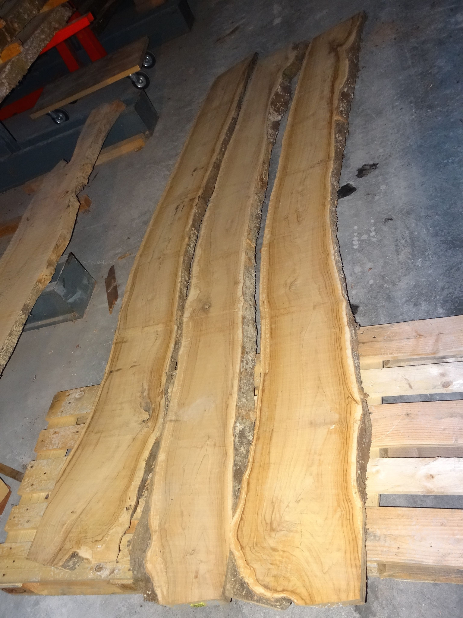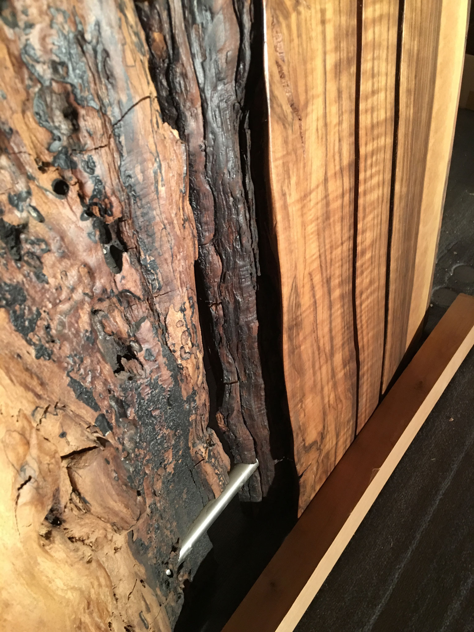 Tisch aus Ulmenholz Schweiz. Teils mit Rinde. Länge 221cm,  Breite 87-92cm  Zuspitzung auf 1 Seite auf 60cm Breite.