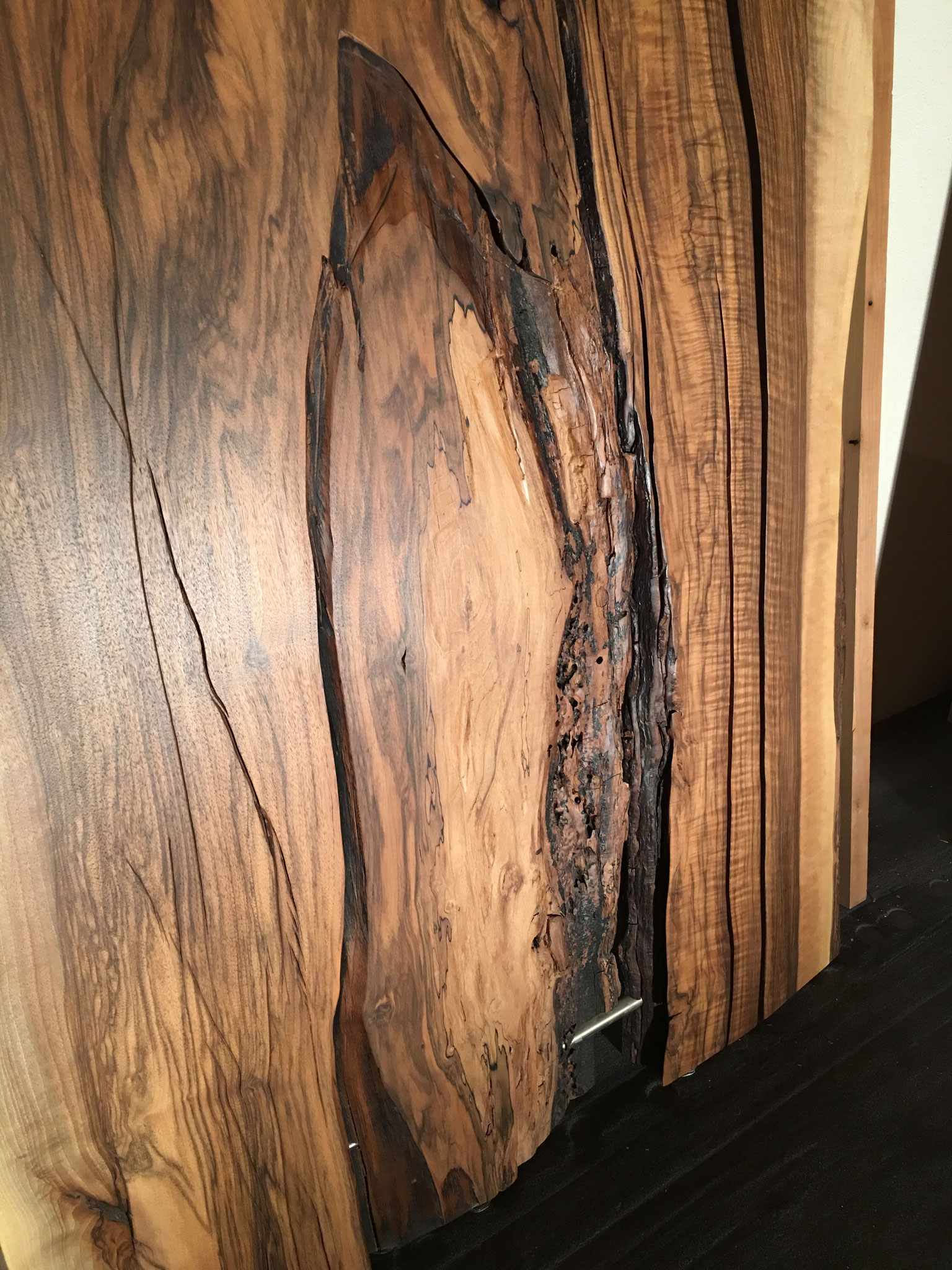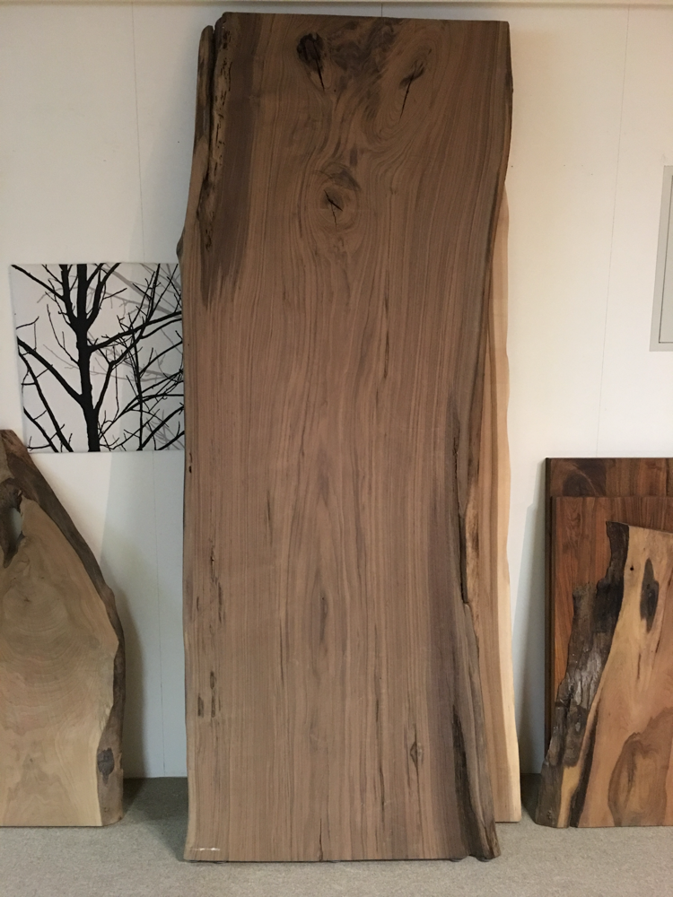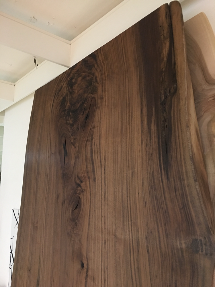 Riesenbaum-Brett, Schwarznussbaum. Extrem schöne Aussen-Naturkante. Herkunft Italien. Nr. 8705/2. Länge 262cm, Breite 73-105cm.