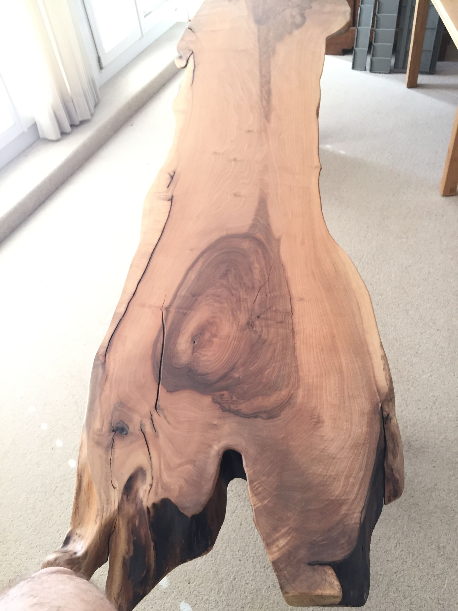 Urige Nussbaum-Platte. Mit Riss von Blitzschlag. Nr. 1090. Länge 265cm. Breite 75-95cm. RESERVIERT.
