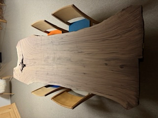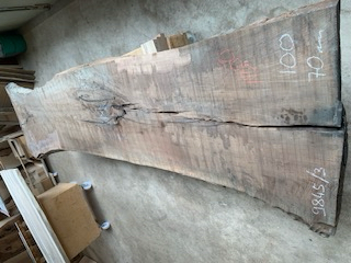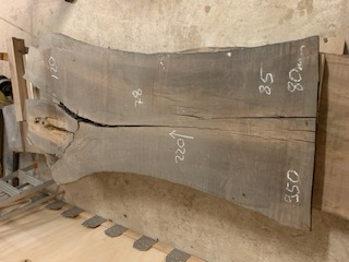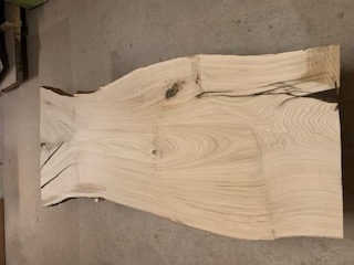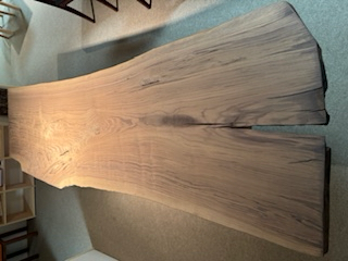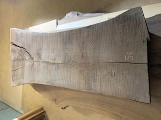 Dickes Ulmen-Brett mit schöner Naturkante. Spalt von unten her. Länge 283cm, Breite 50-73cm, Dicke 5,5cm
